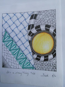 I started this on Wednesday and got so frustrated because it was looking really ugly to me, but I tried to use the "mistakes" as inspirations and I didn't end up throwing it away or starting over. I just kept with it and now I actually kind of like how it turned out, even though my drogons are not perfect and my African Artist NEVER comes out right. I am really challenged by those wavy line patterns. Anyway...here is my #158. Happy tangling!Tangled Tidibts -