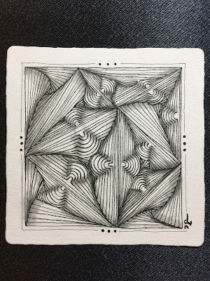 This challenge is so much fun! I love the idea of Bumpadox so much I have to submit two tiles. I like Paradox and use it, but it's not one of my go-to tangles. Maybe just a little too linear for me? As soon as I saw Carole Ohl's step-outs for the variation, I knew it was for me. Looking at her "bumps," I thought they cried out for orbs in the center. So the first tile is from my sketchbook, where I sprinkled the orbs randomly in the triangles and then began the Paradox lines. As Bumpadox developed, it reminded me of Arukas, because I'm never really sure where that design is going to end up either. The second tile is a larger 6"x6" format. The string is in there somewhere, I promise. I randomly placed the orbs again and deliberately added some centered on the line forming the triangles where the fan shape would emerge. I also worked in a trio of partial Arukas. Such a calming, happy experience in an otherwise aggravating week. That is probably Zentangle's greatest gift...moments of tranquility. Thanks, Adele!